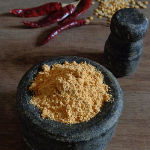 Andhra paruppu podi or Kandi podi to be served with hot plain rice with a spoon of ghee or gingelly oil.