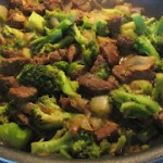 Slice stew meat thin, brown in skillet on high heat. Mix teriyaki sauce and sugar together, set aside. Add onion, broccoli, and sauce after meat is brown. Cover and cook on medium heat for about 15 minutes. Serve with rice.