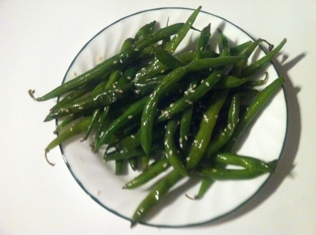 Wash and trim the beans. Steam the green beans for 5 minutes. Add 1 pinch of salt in the process of steaming. When the green beans are ready put in a large bowl, then add: salt, pepper, sesame seeds (or walnuts are good as well). Add oregano and 2 tablespoons of olive oil mix very well. If you wish, add vinegar. Serve warm of cold. Both ways it will be amazing!