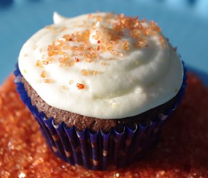 This is a delicious recipe for those of us with a pension towards the orange chocolate combo. These are made with melted chocolate, orange zest and bits of orange flavored chocolate. The frosting on them is smooth, sweet and delicious with a bit of twang.
