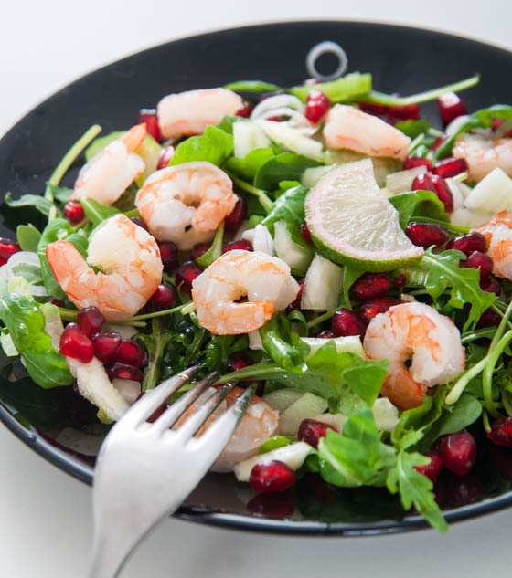 A delicious, healthy and easy to make prawn salad with rocket leaves and lots of pomegranate seeds. (GLUTEN-FREE, DAIRY-FREE,HIGH IN FIBRE)