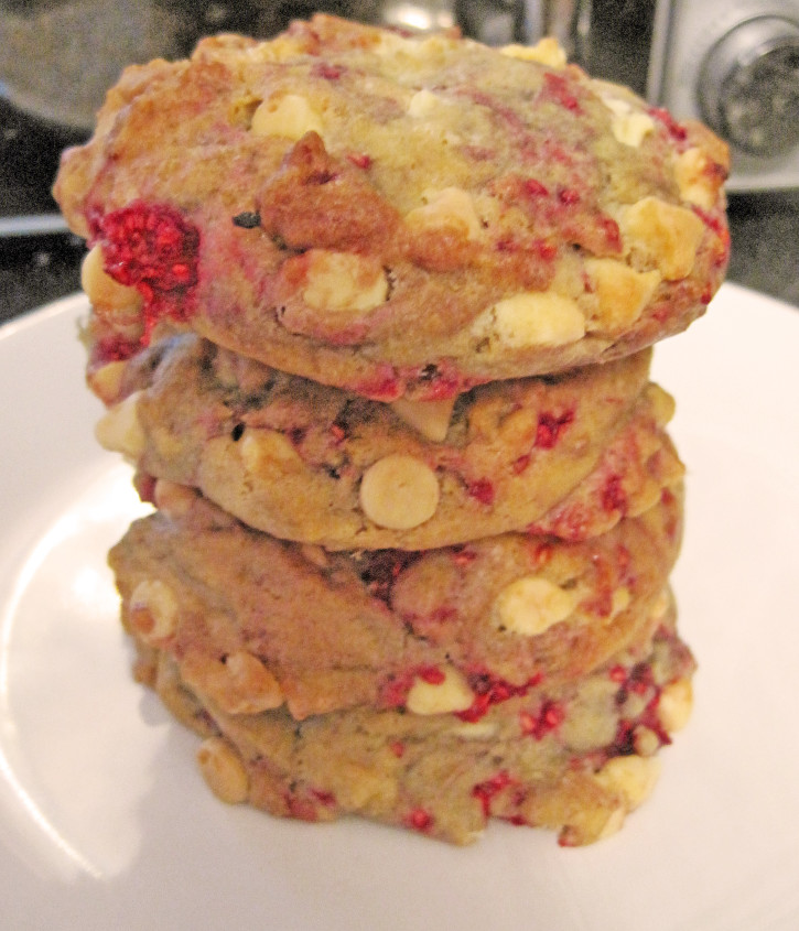 These are absolutely delicious. Tartness from the raspberries and sweetness from the white chocolate. Thick and chewy cookies.