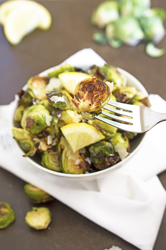 Roasted Garlic Brussels Sprouts tossed with lemon juice, Parmesan cheese, and garlic. Easy side dish that can be made in less than 30 minutes.