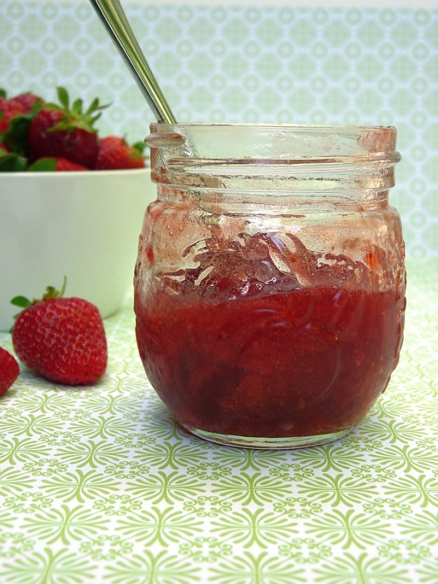 I wanted to make the most of my find so I decided to make No-Cook Strawberry Jam. The good thing about this recipe is you need less than 2 cups of strawberries to make a batch, so I had more than enough. Plus, it is such an easy way to make jam. No boiling, no sterilizing and ready in about a half an hour.