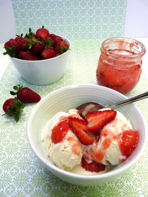 Once I had my jam made, I needed to find a proper use for it. I opted to spoon it over some vanilla ice cream and add a few slices of fresh berries. Then, I sat on my front porch and enjoyed my first bowl of summer sunshine!