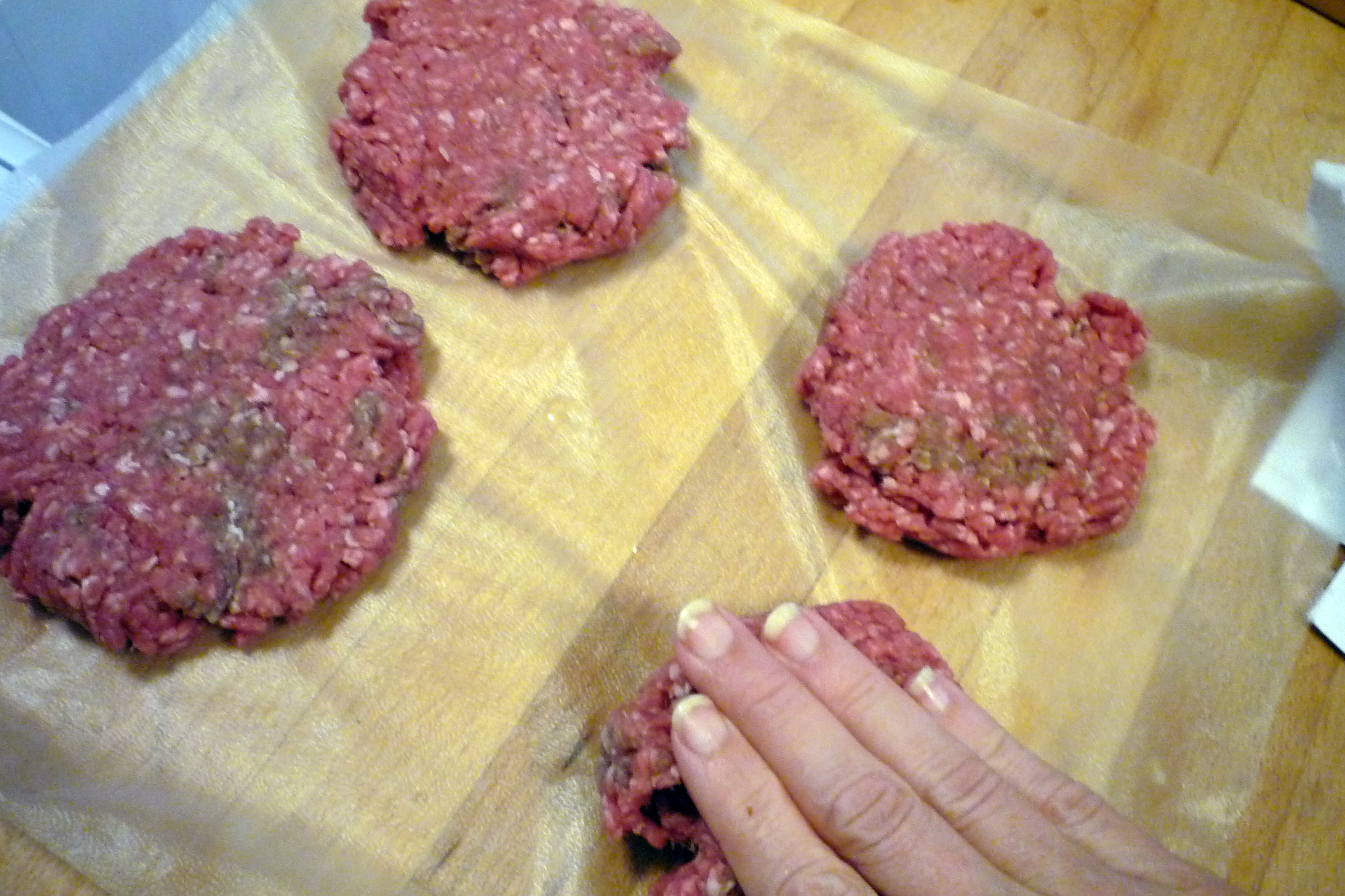 Lay out 4 balls on a sheet of plastic, and press to shape.