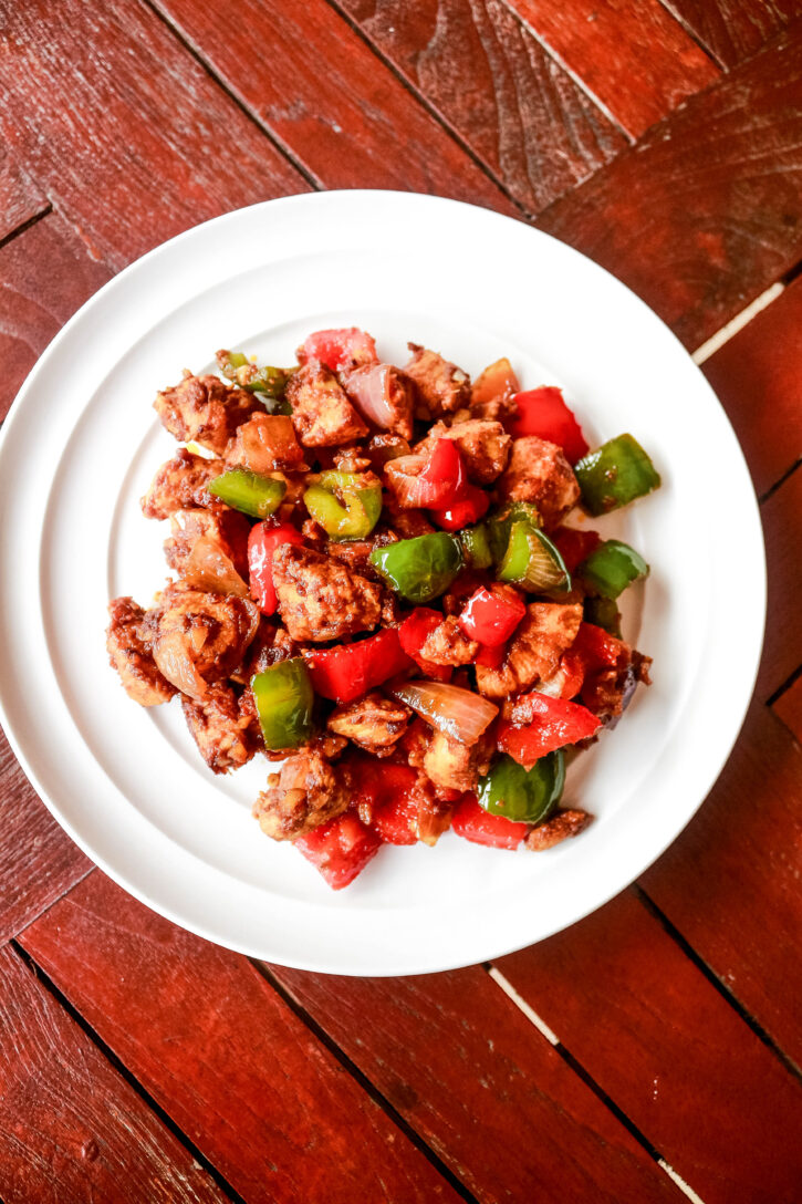 Capsicum chicken is a spicy dish that is popular in Chinese cuisine. It includes ingredients such as capsicum, onion, garlic, and sauces.